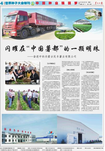 2014年5月27日,農民日報世界種子大會特刊以 “中國種業(yè)強國夢” 為主題刊登了《閃耀在“中國薯都”的一顆明珠——奮進中的民豐薯業(yè)有限公司》一文。